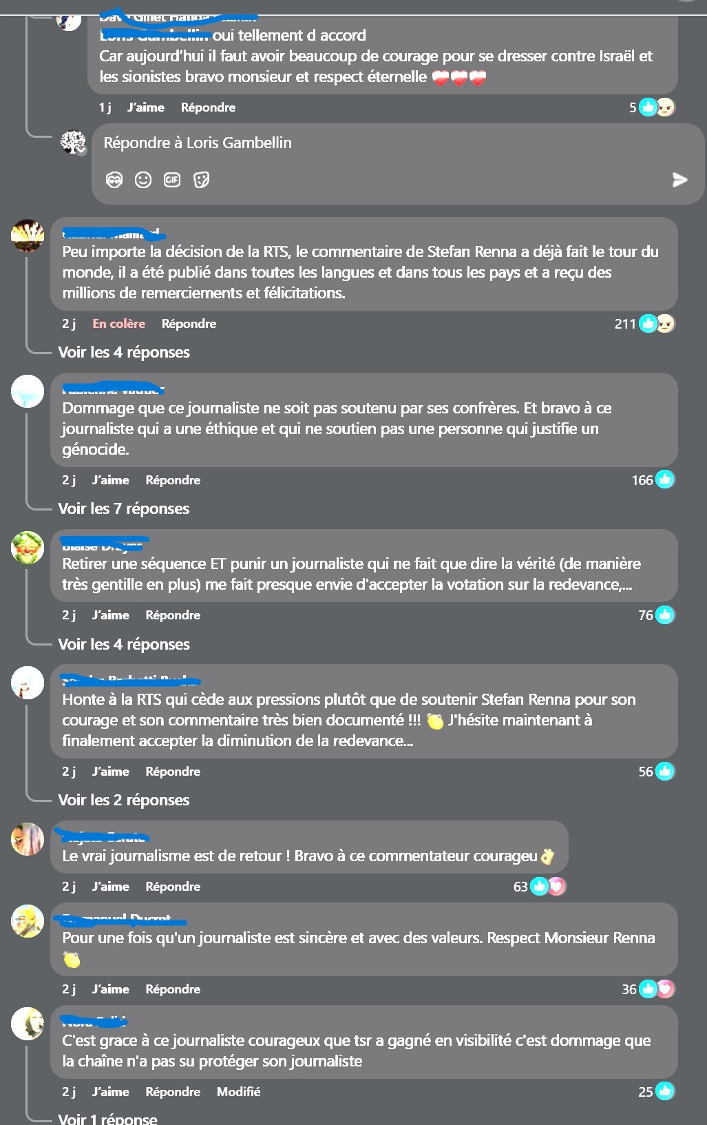 Quand une personne poste sur son propre mur de réseau social pour pro Kremlin ou autre pro régime de dictateur, ça passe comme une lettre à la poste à la liberté d'exprimer ses pensées. Mais, quand c'est un poste sur son mur en faveur d'Israël au gouvernement, on voit l'antissémitisme même grandir dans la sphère publique, c'est à dire une chaine TV nationale principale de la Suisse. Même si cela concerne un seul journaliste qui par sa profession devait être neutre, c'est comme ça en douceur que ça commence aussi partout ailleurs où les mots et les aveux sont acceptés sans être condamnés. Et, même si la RTS ont retiré ce moment de commentaire de haine antisémite c'est trop tard, d'autres Relay ont enregistré et l'ont diffusé dans les réseaux sociaux.